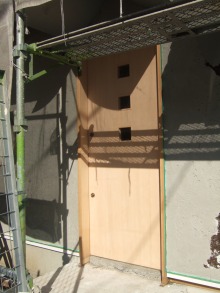 いつもの無添加住宅の無垢玄関ドアに見えますが・…